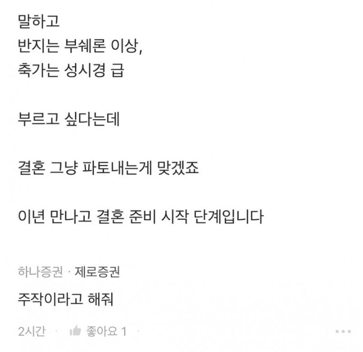 카테고리 없음 결혼식에 축가로 가수 성시경 부르자는 여자친구(블라) by 마케팅하는개발자 2024. 7. 29. 반응형 반응형 공유하기 게시글 관리 공부하는개발자 저작자표시 (새창열림) 댓글