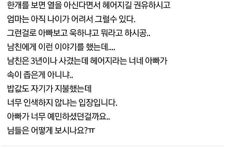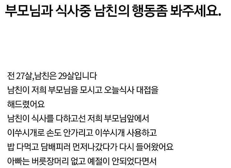 카테고리 없음 남친의 식사예절을 보고 헤어지길 권유하는 부모님 by 마케팅하는개발자 2024. 6. 13. 반응형 반응형 공유하기 게시글 관리 공부하는개발자 저작자표시 (새창열림) 댓글