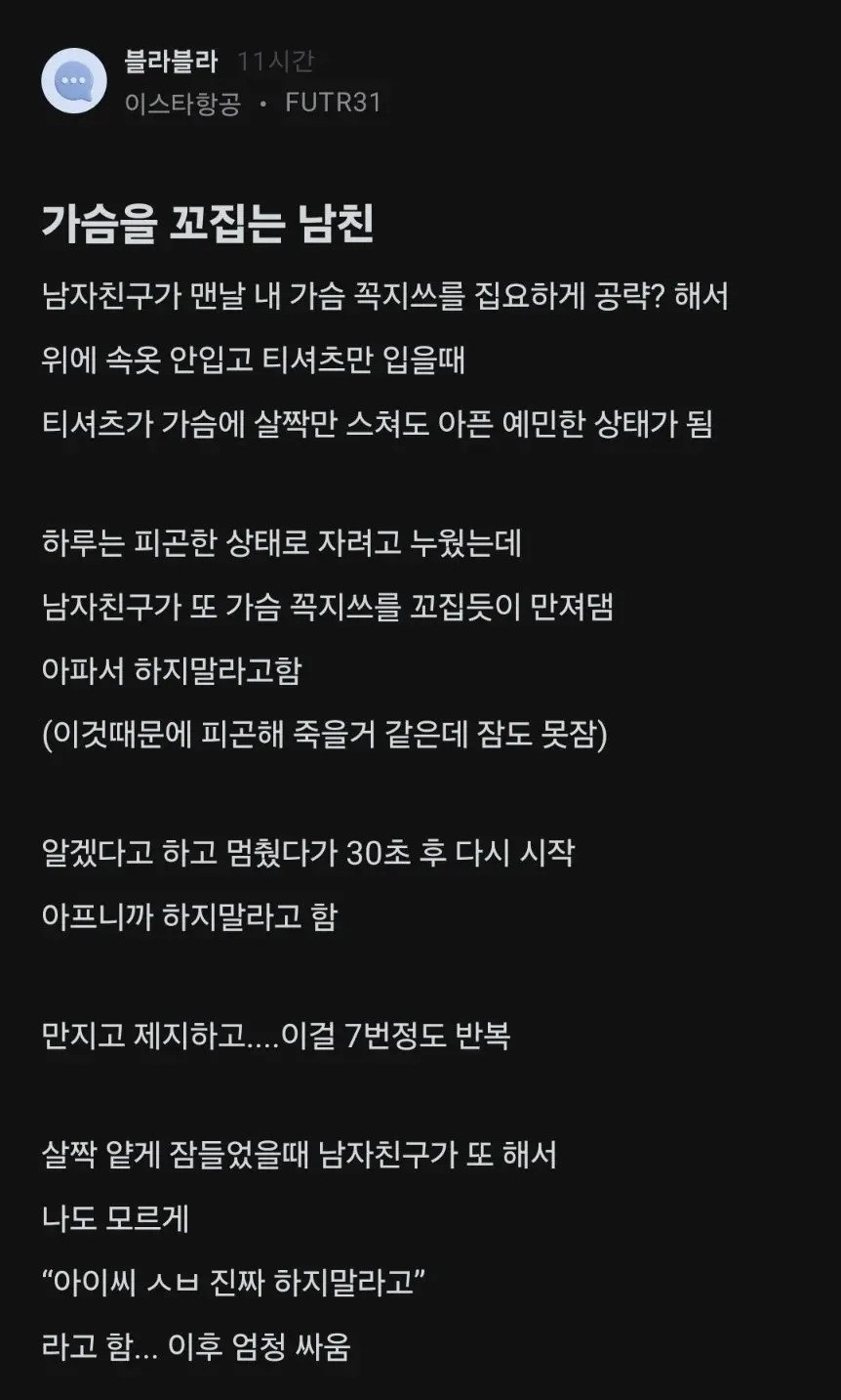 카테고리 없음 남친이 맨날 꼭ㅈ를 아프게 꼬집어대서 화난 블라인 by 마케팅하는개발자 2024. 5. 16. 반응형 반응형 공유하기 게시글 관리 공부하는개발자 저작자표시 (새창열림) 댓글