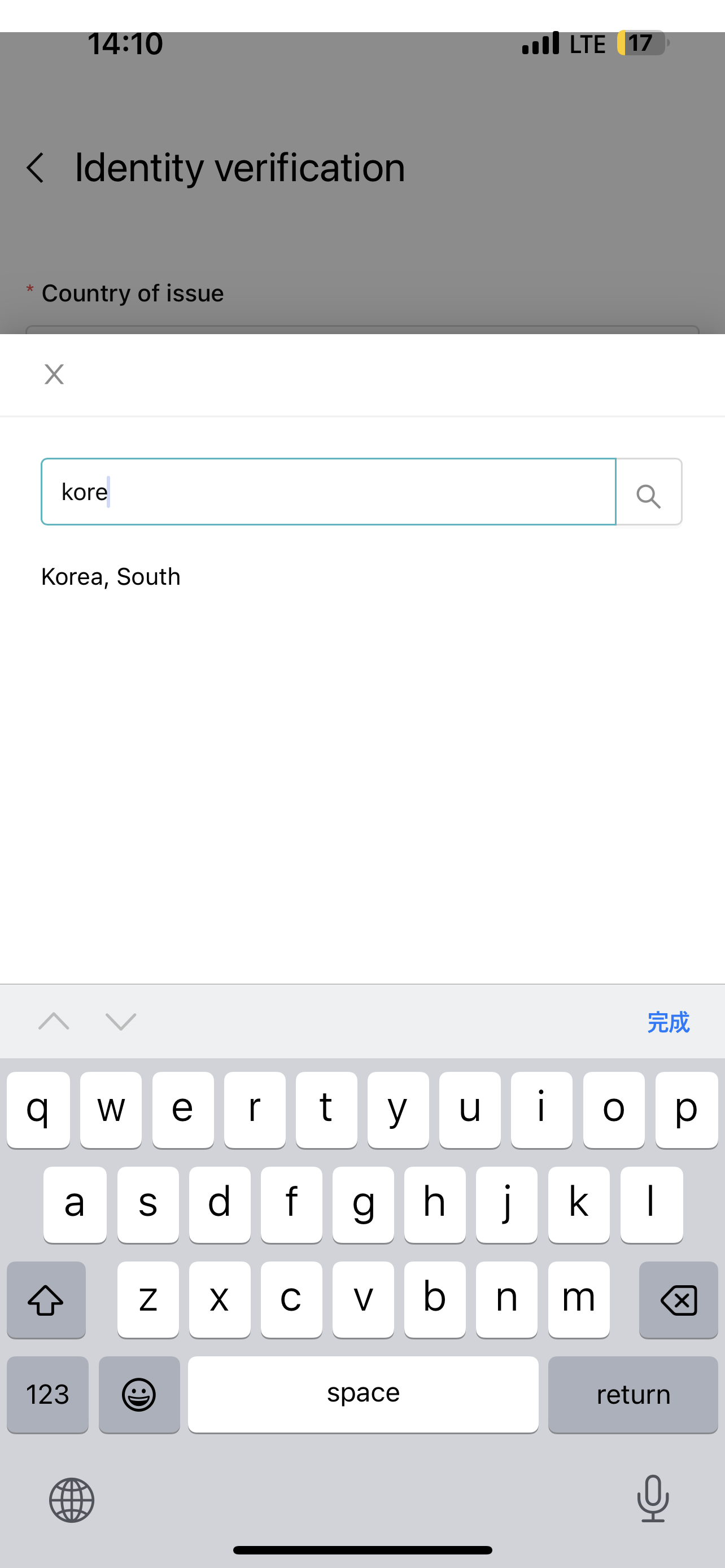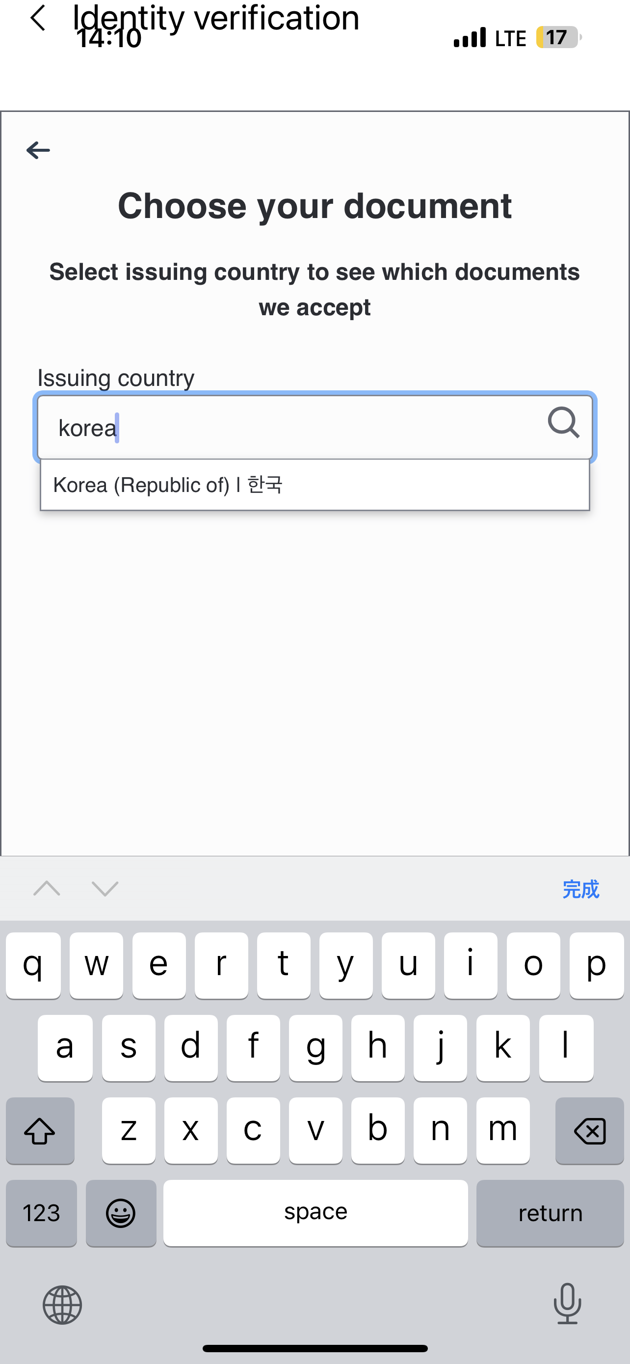 - 앱에서 'Unverified' 상태로 들어가서 국적을 'Korea, South'로 선택한 후 'Verify now'를 클릭합니다.