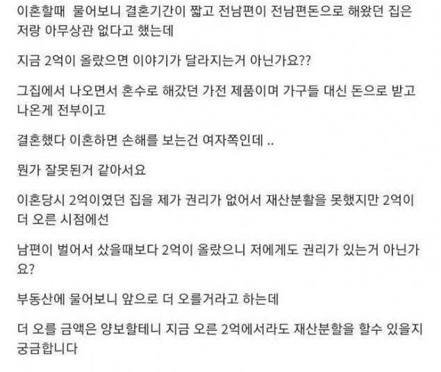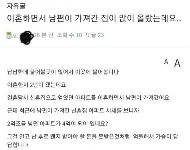 카테고리 없음 이혼하면서 남편이 가져간 집이 두배가 올랐어요.. by 마케팅하는개발자 2024. 5. 3. 반응형 반응형 공유하기 게시글 관리 공부하는개발자 저작자표시 (새창열림) 댓글
