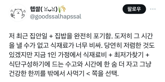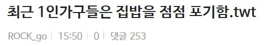 카테고리 없음 최근들어 1인 가구들이 점점 포기하고 있다는 것. by 마케팅하는개발자 2024. 7. 14. 반응형 반응형 공유하기 게시글 관리 공부하는개발자 저작자표시 (새창열림) 댓글