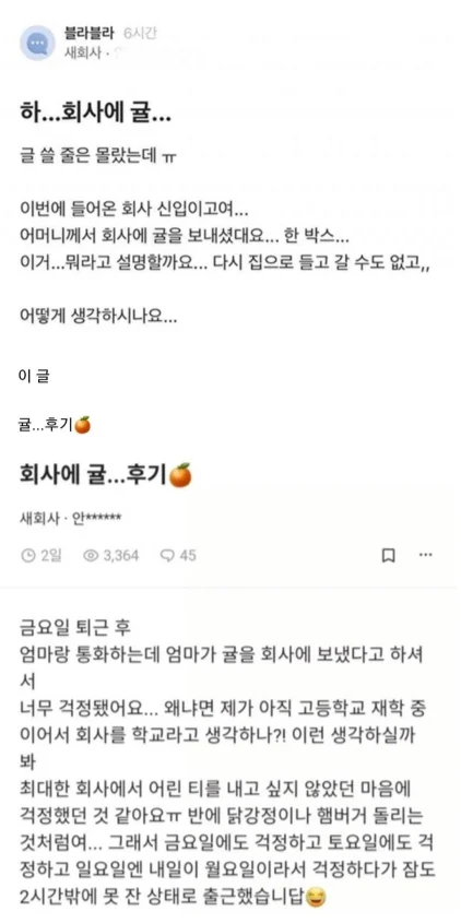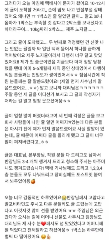 카테고리 없음 회사 신입 어머니가 회사에 귤 보냈다는 글 후기 by 마케팅하는개발자 2024. 7. 3. 반응형 반응형 공유하기 게시글 관리 공부하는개발자 저작자표시 (새창열림) 댓글