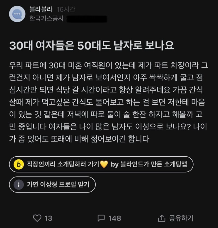 카테고리 없음 30대 여자들은 50대도 남자로 보나요?? (+댓글) by 마케팅하는개발자 2024. 6. 3. 반응형 반응형 공유하기 게시글 관리 공부하는개발자 저작자표시 (새창열림) 댓글