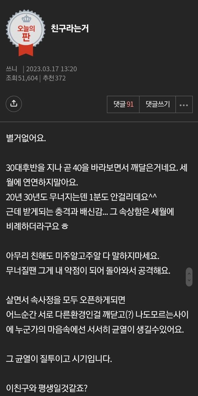카테고리 없음 30대 후반이 되고서야 깨달은 '친구'라는 존재 by 마케팅하는개발자 2024. 5. 19. 반응형 반응형 공유하기 게시글 관리 공부하는개발자 저작자표시 (새창열림) 댓글