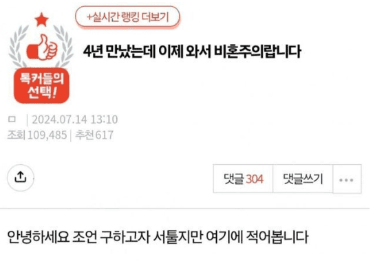 카테고리 없음 4년이나 만났는데 이제 와서 비혼주의라는 남자친구 by 마케팅하는개발자 2024. 7. 17. 반응형 반응형 공유하기 게시글 관리 공부하는개발자 저작자표시 (새창열림) 댓글
