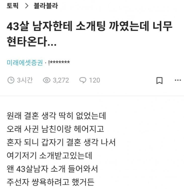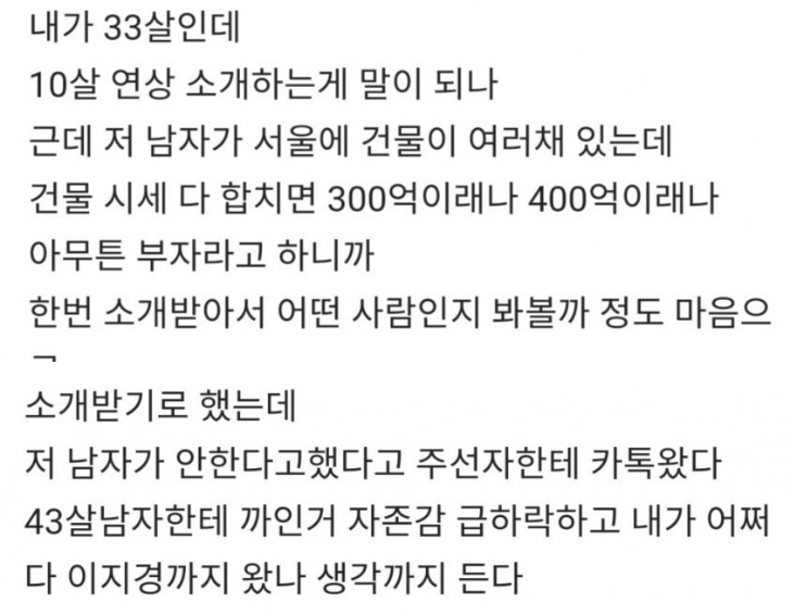 카테고리 없음 43세 남자한테 소개팅 ㄲ여서 현타온 블라녀 by 마케팅하는개발자 2024. 6. 15. 반응형 반응형 공유하기 게시글 관리 공부하는개발자 저작자표시 (새창열림) 댓글